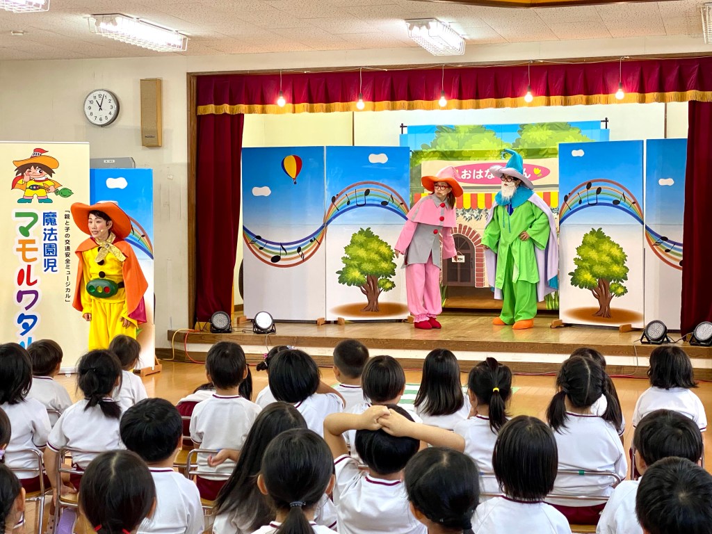 教育目標の一つに「じぶんでかんがえてやるよ」とある通り、年中・年長の園児たちはミュージカルを楽しみながらたくさん発言して交通ルールのお勉強をしました。年少さんも最後まで楽しんで見てくれました。