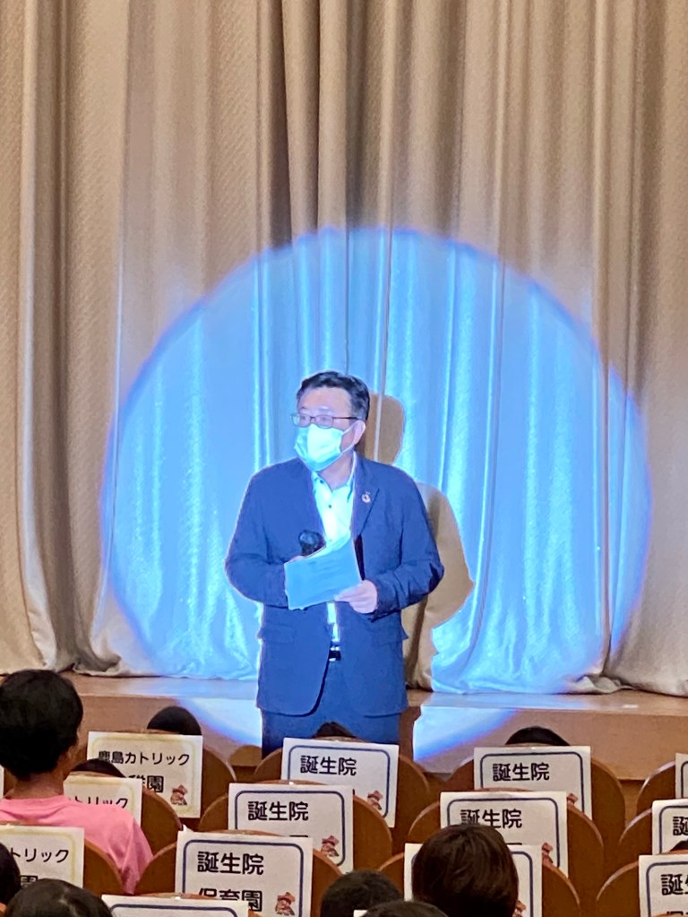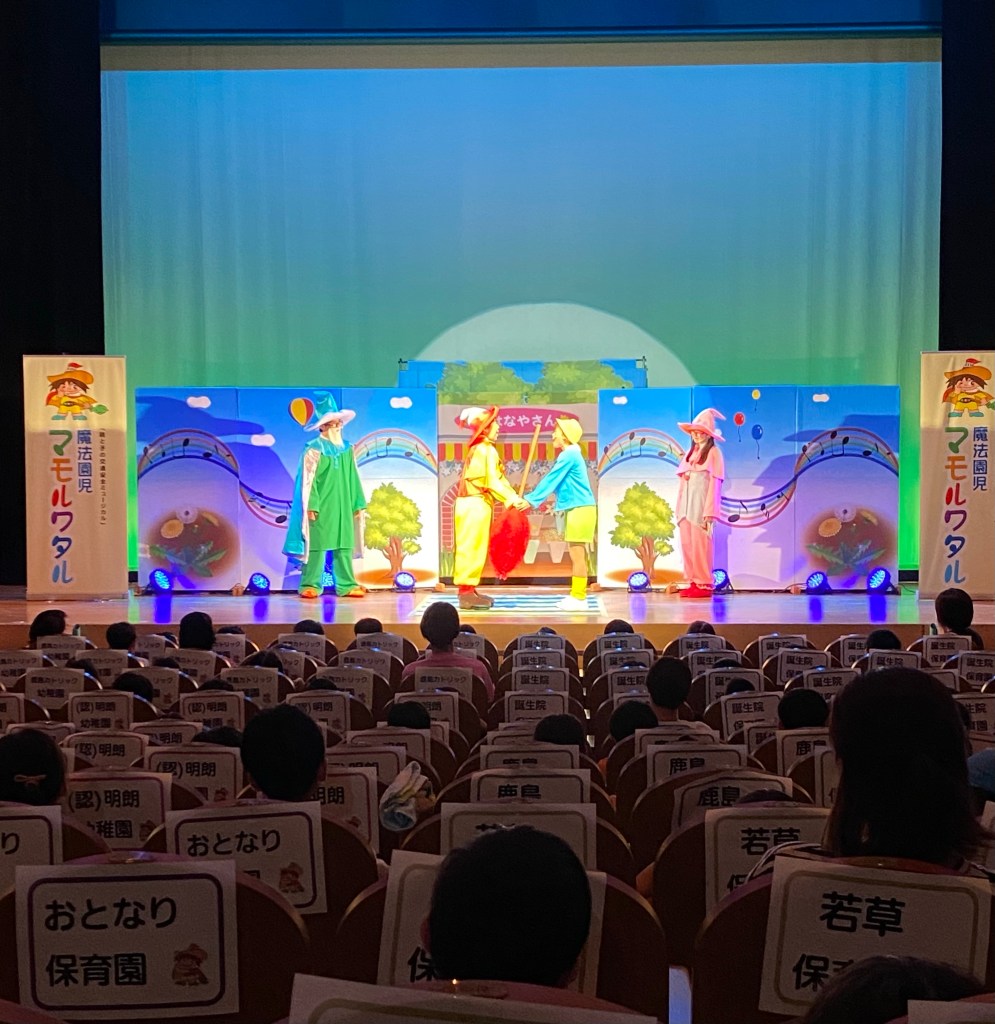 12園総勢217名の園児たちで会場は満席。みんな揃っての「こんにちは!」は大迫力!マモルワタルくんたちも負けずに張り切っちゃうぞ!