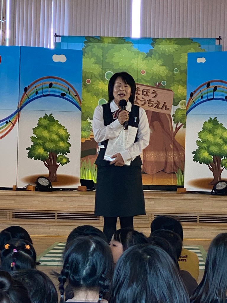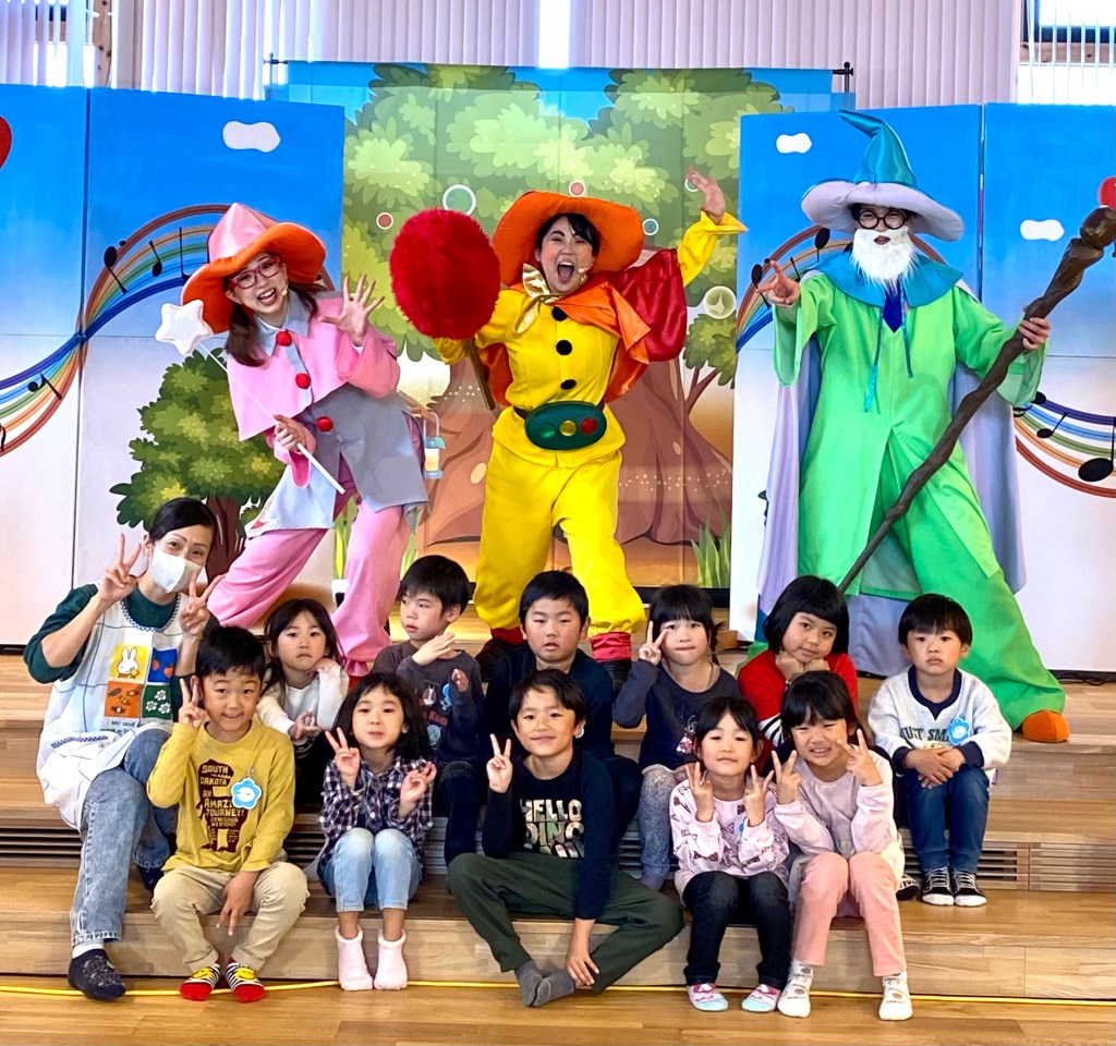 終演後の園児からマモルワタルくんたちへのお礼の言葉は、代表して年長さんみんなで声を合わせて伝えてくれました。長い文章をみんなで覚えて伝えてくれたのでマモルワタルくんたち感動してウルッときたよ。ありがとう!