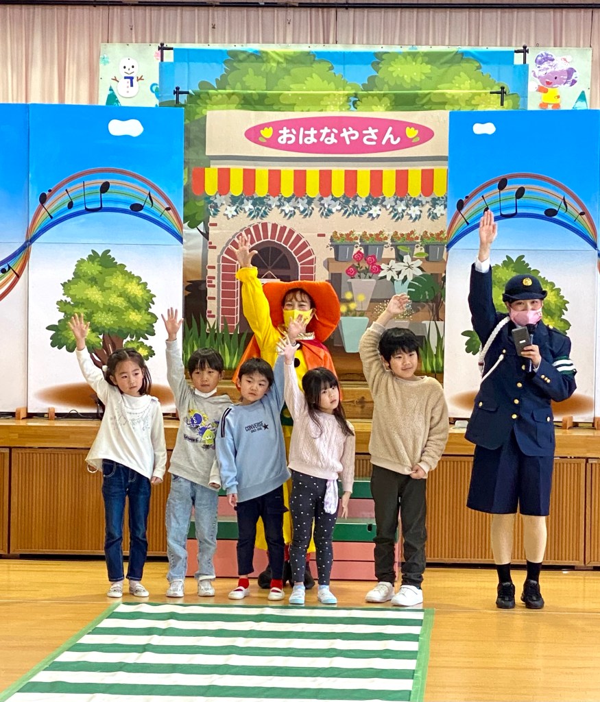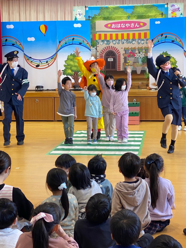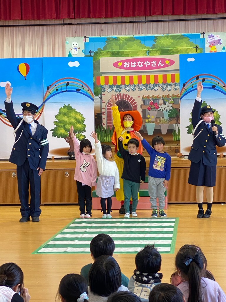 みんなミュージカルで交通安全を学んでくれたよ!年中さん年少さんもしっかり見て聞いて難しいクイズにも大きな声で答えてくれたよ。